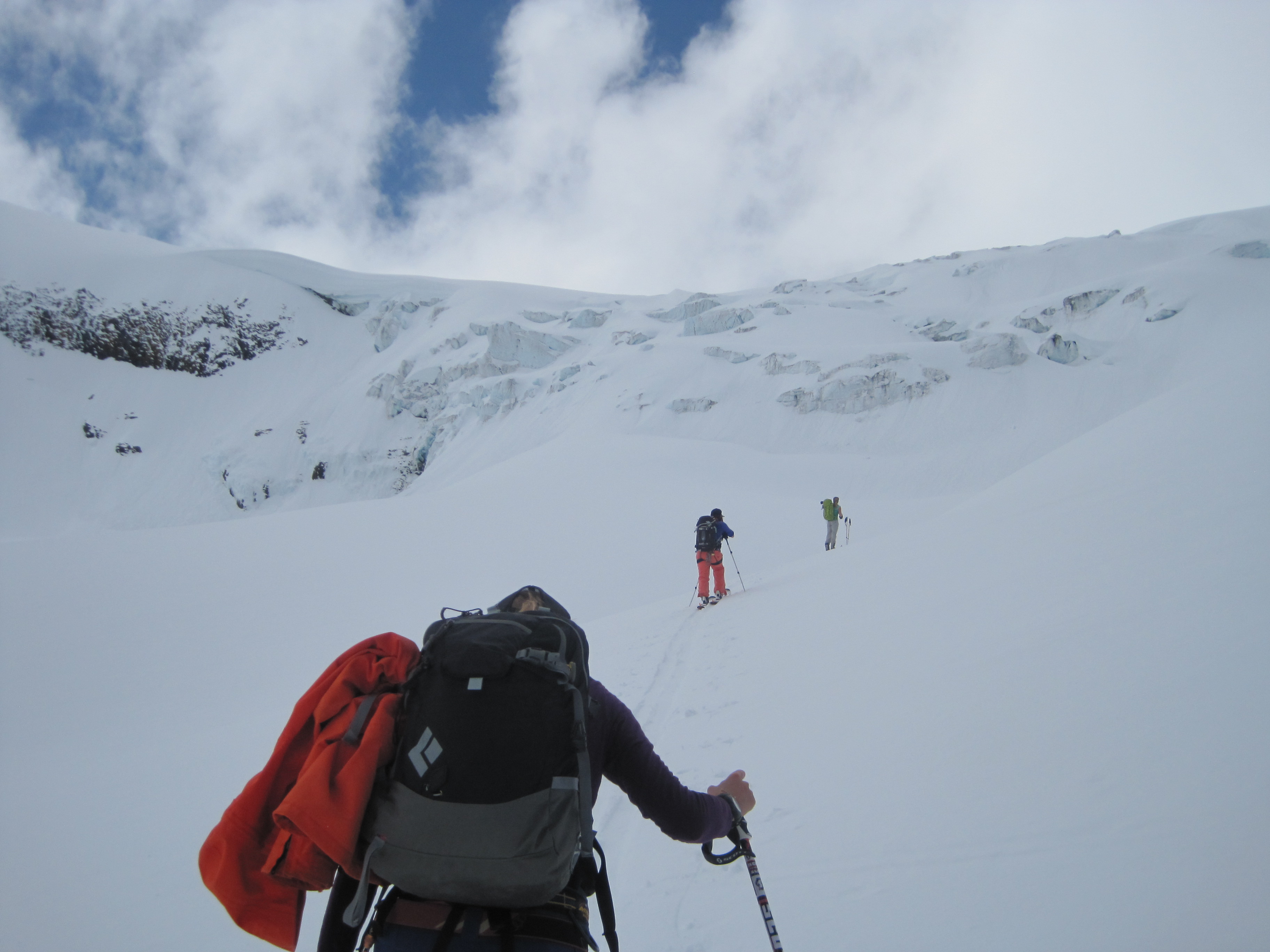 Heading up the icefall, steep creamy turns lay ahead